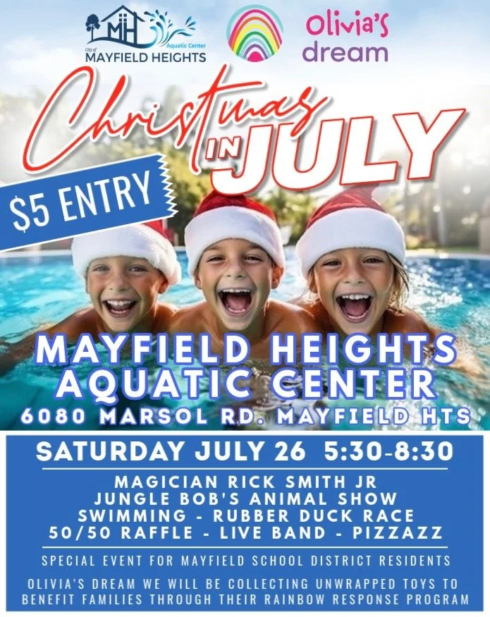 The City of Mayfield Heights and Olivia's Dream will hold a Christmas in July event on Saturday, July 26th. Residents of the Mayfield School District are invited to attend with their family and friends at the Mayfield Heights Aquatic Center, located at 6080 Marsol Road in Mayfield Heights. Activities are scheduled from 5:30 PM to 8:30 PM.